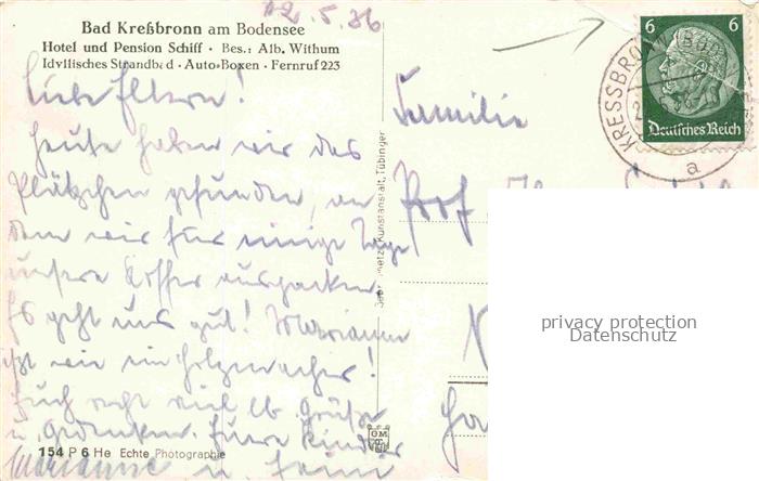 74036513 alte Postkarte Kressbronn Bodensee Hotel Pension Schiff postalisch gelaufen Erhaltung siehe scans [WerneD78] KatCode: 11110008435029