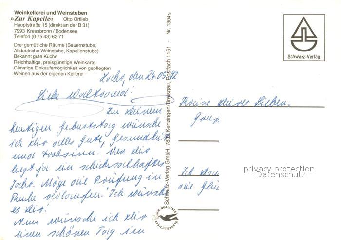 73324336 Kressbronn Bodensee Weinkellerei Weinstuben Zur Kapelle postalisch nicht gelaufen Erhaltung siehe scans [FriedD77] KatCode: 11110008435029