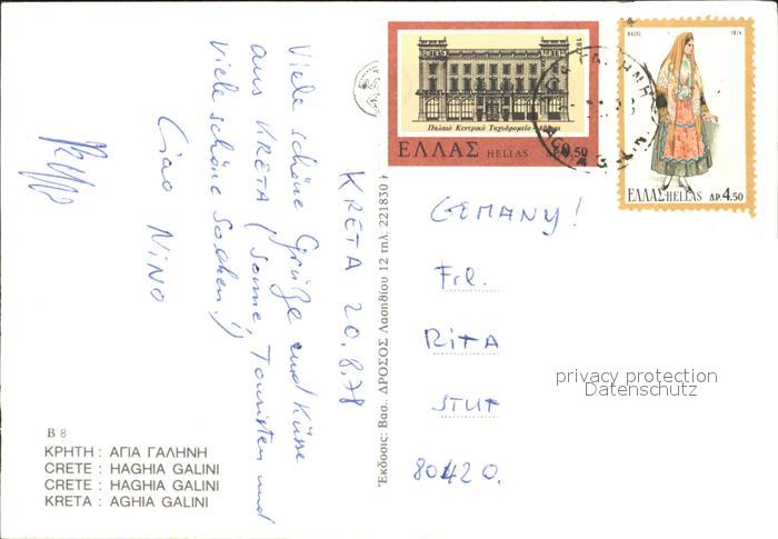 old postcard Kreta Crete Ag. Galini Strand Hafen Boote postalisch gelaufen Erhaltung siehe scans