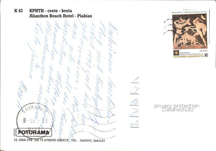 old postcard Kreta Crete Alianthos Beach Hotel Plakias postalisch gelaufen Erhaltung siehe scans
