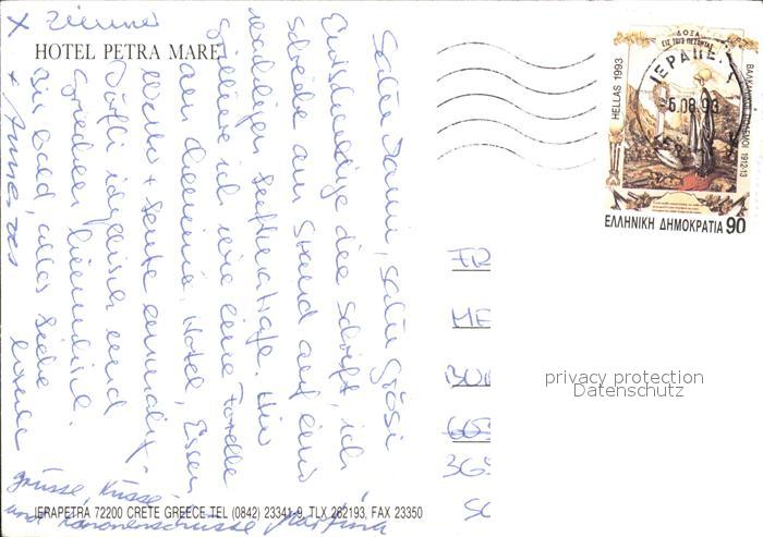 old postcard Kreta Crete Hotel Petra Mare postalisch gelaufen Erhaltung siehe scans