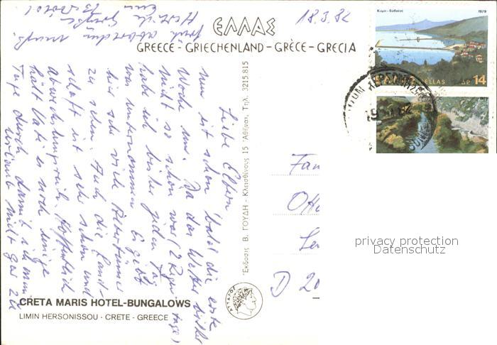 old postcard Kreta Crete Maris Hotel-Bungalows postalisch gelaufen Erhaltung siehe scans