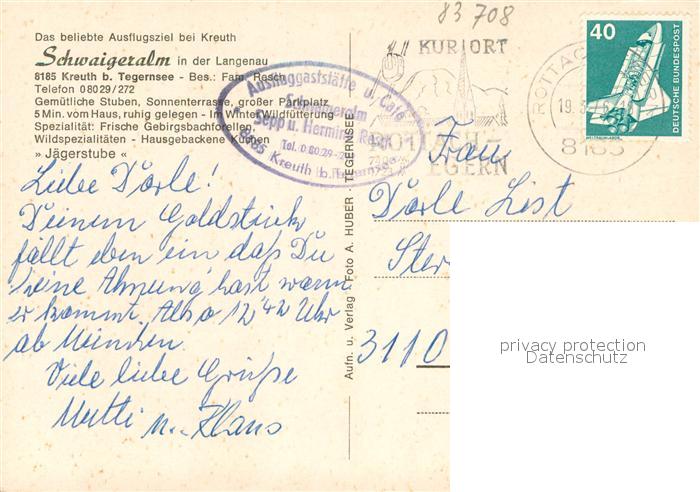 73646314 alte Postkarte Kreuth Tegernsee Ausflugsgaststaette Cafe Schwaigeralm Gastraum postalisch gelaufen Erhaltung siehe scans [FriedD77] KatCode: 11110009182124
