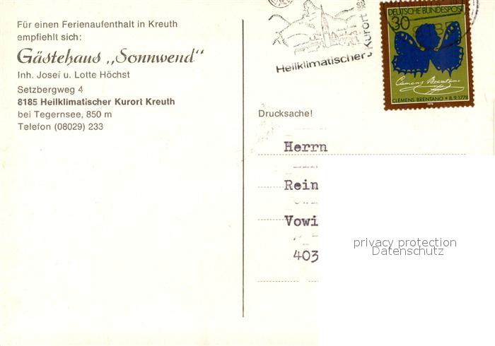 73544854 alte Postkarte Kreuth Tegernsee Gaestehaus Sonnwend postalisch gelaufen Erhaltung siehe scans [FriedD77] KatCode: 11110009182124