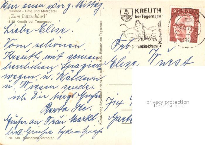 73632932 alte Postkarte Kreuth Tegernsee Gasthof Cafe Metzgerei Zum Batzenhaeusl postalisch gelaufen Erhaltung siehe scans [WerneD78] KatCode: 11110009182124