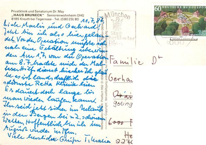 73888178 alte Postkarte Kreuth Tegernsee Privatklinik und Sanatorium Dr. May Haus Bruneck Seniorenwohnheim postalisch gelaufen Erhaltung siehe scans [FriedD77] KatCode: 11110009182124