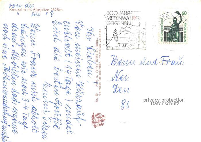 74104219 Kreuzalm 2628m MITTENWALD Bayern mit Alpspitze postalisch gelaufen Erhaltung siehe scans [WerneD78] alte Postkarte Wern Katcode 11110009180123
