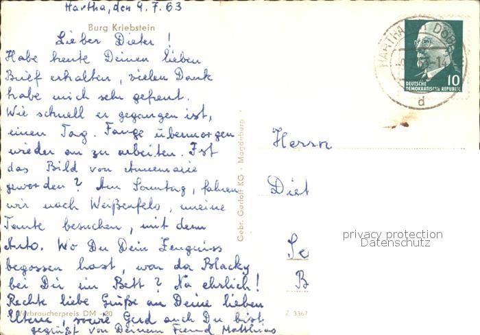 72168500 alte Postkarte Kriebstein Burg postalisch gelaufen Erhaltung siehe scans KatCode: 11110014182210