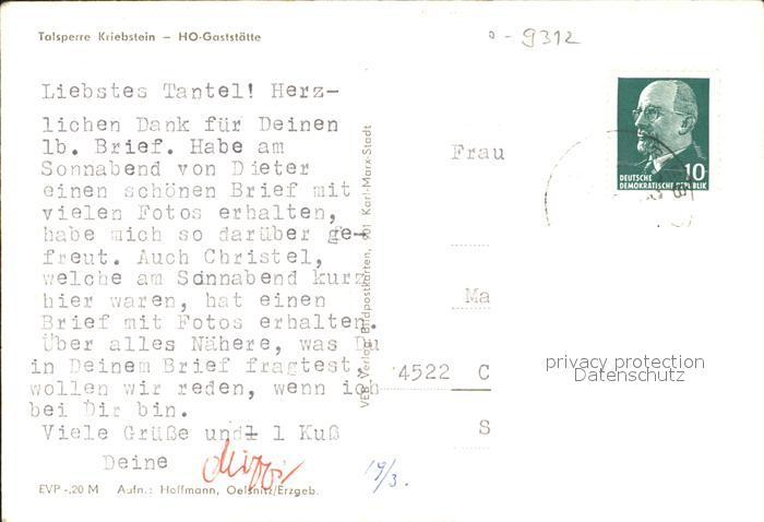 72343380 alte Postkarte Kriebstein HO Gaststaette an der Talspere postalisch gelaufen Erhaltung siehe scans KatCode: 11110014182210