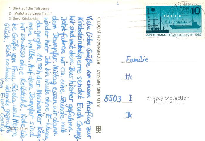 73157696 alte Postkarte Kriebstein Landschaftspanorama Talsperre Waldhaus Lauenhain Burg Kriebstein postalisch gelaufen Erhaltung siehe scans [FriedD77] KatCode: 11110014182210