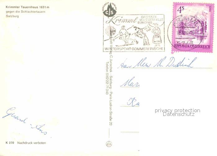 72863687 alte Postkarte Krimml Krimmler Tauernhaus gegen die Schlachtertauern Bergbach postalisch gelaufen Erhaltung siehe scans [FriedD77] KatCode: 11390322050607
