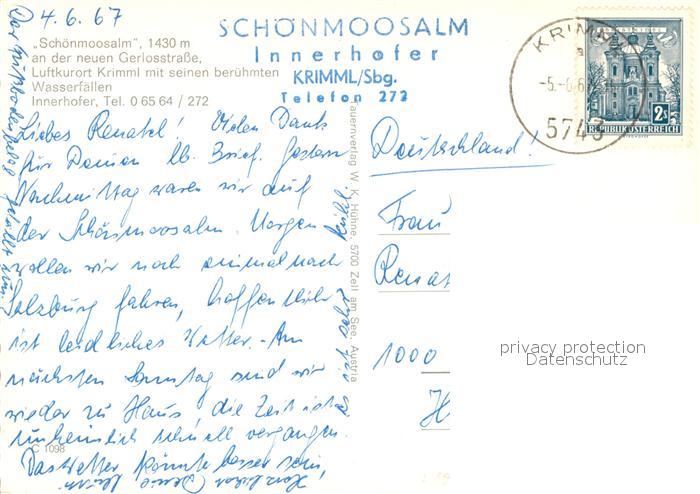 13182939 alte Postkarte Krimml Schoenmoosalm postalisch gelaufen Erhaltung siehe scans [NatalD47] KatCode: 11390322050607