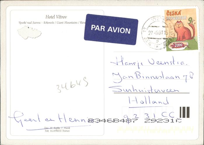 old postcard Krkonose Hotel Vetrov postalisch gelaufen Erhaltung siehe scans
