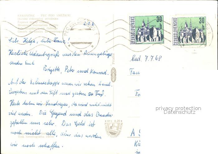 old postcard Krkonose Pez Pod Snezkou postalisch gelaufen Erhaltung siehe scans