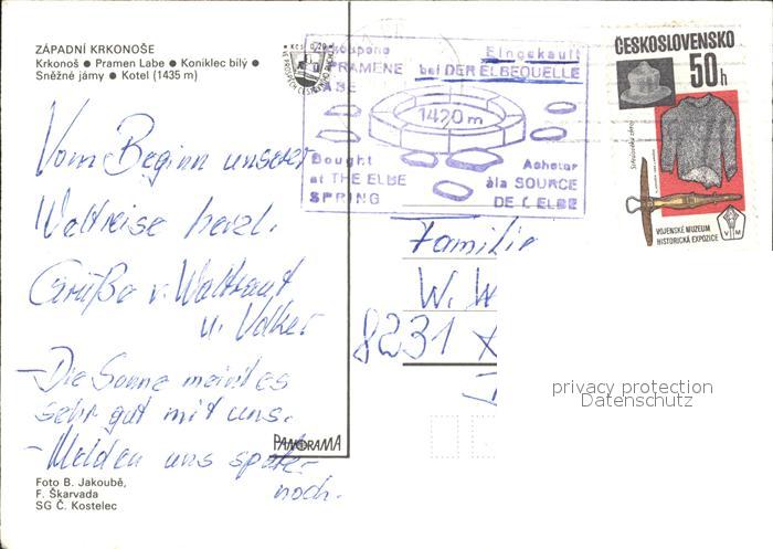 old postcard Krkonose Pramen Labe Koniklec bily Snezne jamy Kotel postalisch gelaufen Erhaltung siehe scans