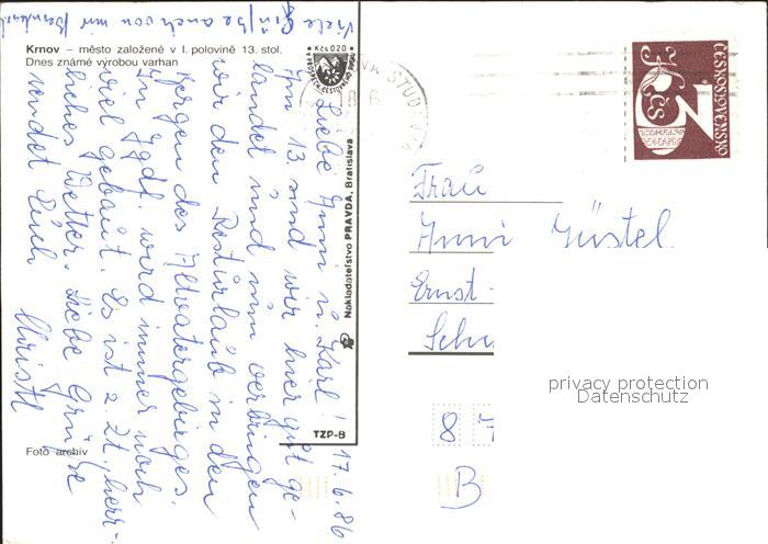 old postcard Krnov Rathaus Strassenpartie Brunnen Kirchtuerme Hochhaus postalisch gelaufen Erhaltung siehe scans