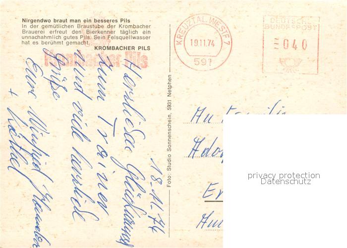 73247890 alte Postkarte Krombach Westfalen Krombacher Brauerei Gaststube postalisch gelaufen Erhaltung siehe scans [KathaD81] KatCode: 11110005970024