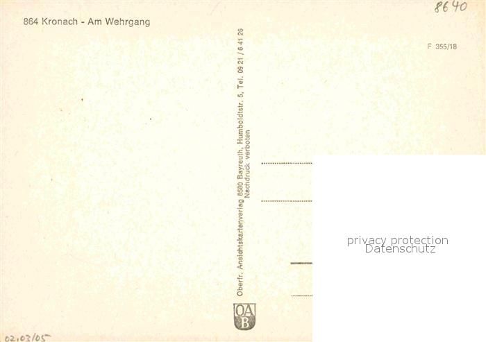 72887489 Kronach Oberfranken Am Wehrgang postalisch nicht gelaufen Erhaltung siehe scans [WerneD78] KatCode: 11110009476145