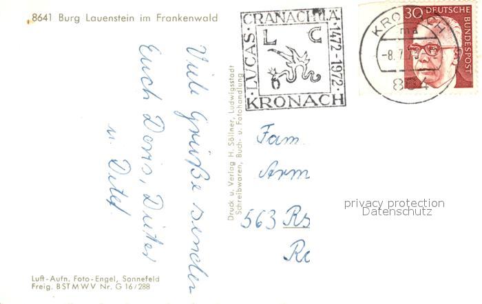 73334199 alte Postkarte Kronach Oberfranken Burg Lauenstein im Frankenwald Fliegeraufnahme postalisch gelaufen Erhaltung siehe scans [WerneD78] KatCode: 11110009476145