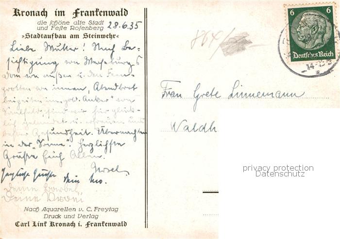73811666 alte Postkarte Kronach Oberfranken Stadtaufbau am Steinwehr Feste Rosenberg Aquarell von C. Freytag Kuenstlerkarte postalisch gelaufen Erhaltung siehe scans [FriedD77] KatCode: 11110009476145