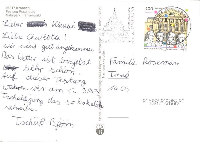 71915193 alte Postkarte Kronach Oberfranken Veste Rosenberg Fliegeraufnahme postalisch gelaufen Erhaltung siehe scans KatCode: 11110009476145