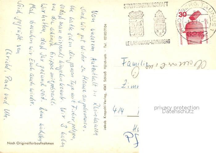 73310297 alte Postkarte Kronberg Taunus Teilansicht Eichentor Burgtor Erholungsheim Tierpark Rathaus Kirche Schirn Freibad postalisch gelaufen Erhaltung siehe scans [FriedD77] KatCode: 11110006434006