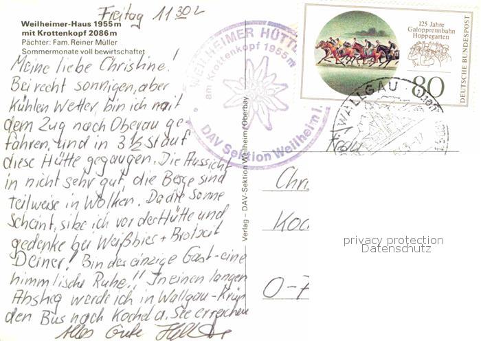 72753312 alte Postkarte Kruen 100 Jahre Weilheimer Haus am Krottenkopf Bayerische Voralpen Wandern postalisch gelaufen Erhaltung siehe scans [FriedD77] KatCode: 11110009180122