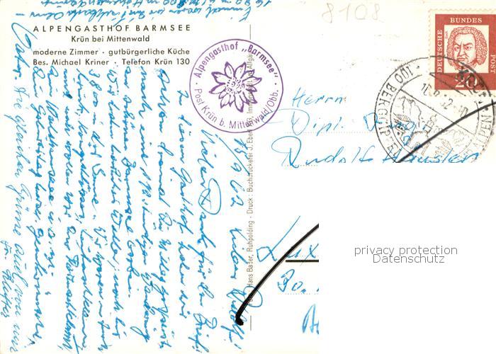 73784942 alte Postkarte Kruen Alpengasthof Barmsee postalisch gelaufen Erhaltung siehe scans [FriedD77] KatCode: 11110009180122