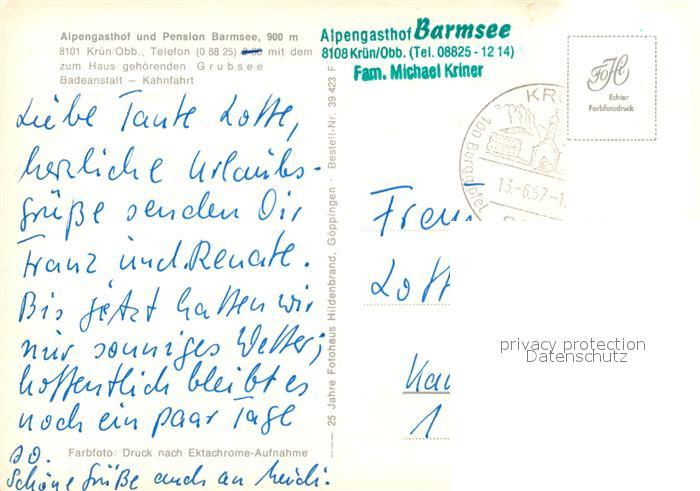 73091843 alte Postkarte Kruen Alpengasthof Pension Barmsee postalisch gelaufen Erhaltung siehe scans [KathaD81] KatCode: 11110009180122