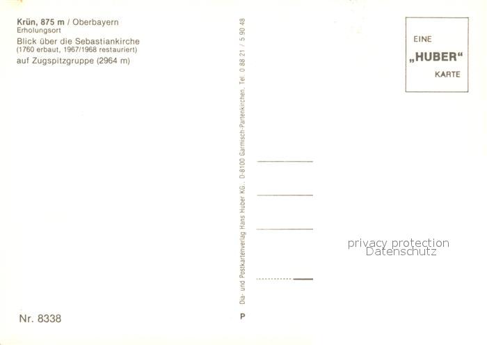 73177835 Kruen Blick ueber Sebastiankirche auf Zugspitzgruppe Wettersteingebirge Huber Karte Nr 8338 postalisch nicht gelaufen Erhaltung siehe scans [FriedD77] KatCode: 11110009180122