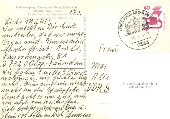 73097948 alte Postkarte Kruen Feriencamping Tennsee Zugspitzmassiv Bischof Wetterstein postalisch gelaufen Erhaltung siehe scans [WerneD78] KatCode: 11110009180122