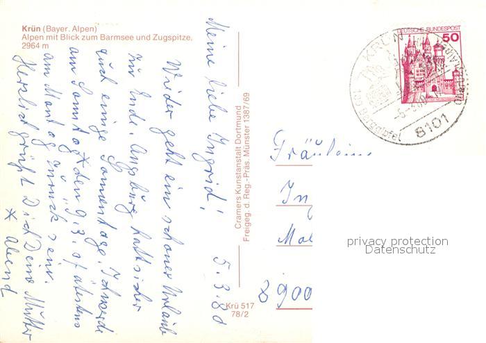 72946777 alte Postkarte Kruen Fliegeraufnahme Alpen Barmsee Zugspitze postalisch gelaufen Erhaltung siehe scans [KathaD81] KatCode: 11110009180122