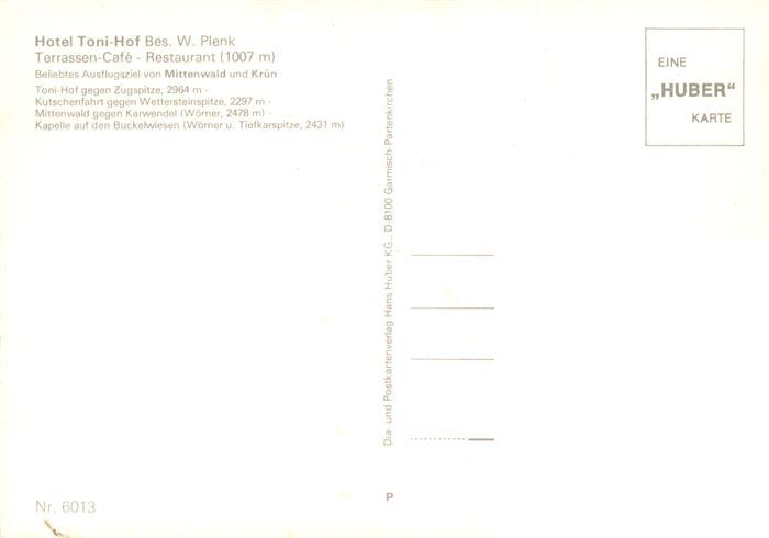 73945063 Kruen Garmisch-Partenkirchen Hotel Tonihof Pferdewagen Kapelle Stadtpanorama Alpen postalisch nicht gelaufen Erhaltung siehe scans [FriedD77] KatCode: 11110009180122