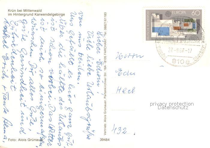 73672160 alte Postkarte Kruen Ortszentrum Blick zum Karwendelgebirge postalisch gelaufen Erhaltung siehe scans [FriedD77] KatCode: 11110009180122