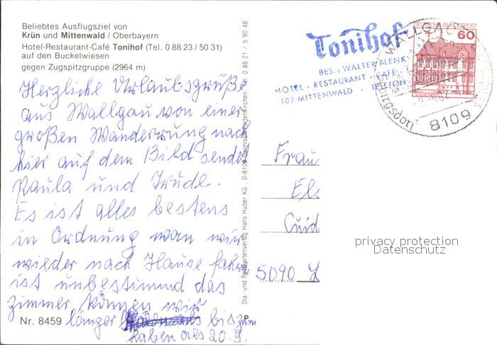 72417404 alte Postkarte Kruen und Mittenwald postalisch gelaufen Erhaltung siehe scans KatCode: 11110009180122