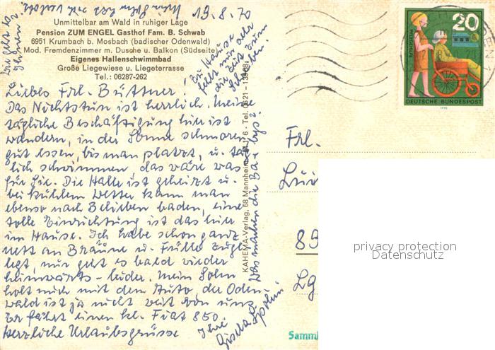 73645006 alte Postkarte Krumbach Odenwald Panorama Pension zum Engel Gaststube Liegewiese Hallenbad postalisch gelaufen Erhaltung siehe scans [WerneD78] KatCode: 11110006431007