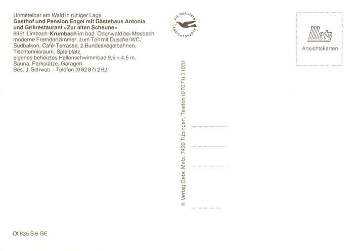 73896415 Krumbach Odenwald Pension Engel Grillrestaurant Zur alten Scheune Panorama Kegelbahn Terrasse postalisch nicht gelaufen Erhaltung siehe scans [WerneD78] KatCode: 11110006431007
