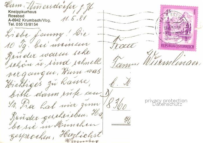 72654268 alte Postkarte Krumbach Vorarlberg Kneippkurhaus Rossbad postalisch gelaufen Erhaltung siehe scans [WerneD78] KatCode: 11390341080221
