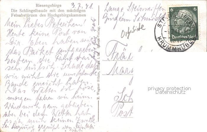 old postcard Krummhuebel Riesengebirge Schlingelbaude Felsabstuerze Hochgebirgskamm postalisch gelaufen Erhaltung siehe scans