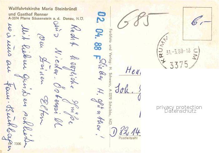 72626710 alte Postkarte Krummnussbaum Wallfahrtskirche Maria Steinbruendl Gasthof Renner Pfarre Saeusenstein postalisch gelaufen Erhaltung siehe scans [FriedD77] KatCode: 11390121031517