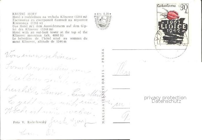 old postcard Krusne Hory Aussichtsturm Berghotel Klinovec Gipfel postalisch gelaufen Erhaltung siehe scans