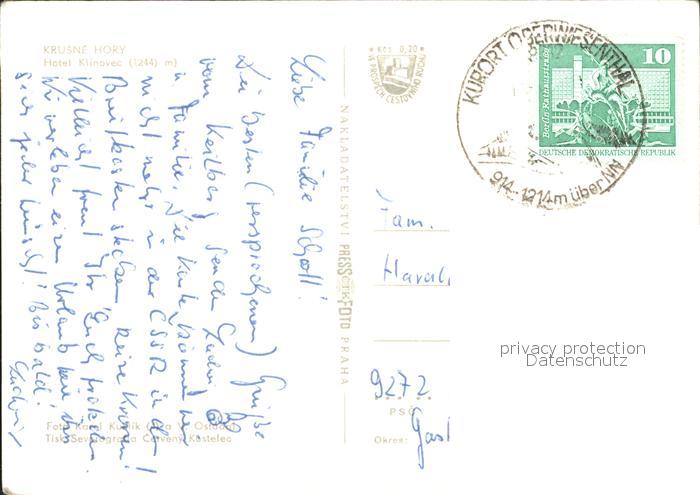 old postcard Krusne Hory Hotel Klinovec postalisch gelaufen Erhaltung siehe scans
