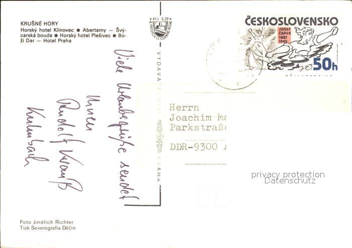 old postcard Krusne Hory Hotel Klinovec Hotel Plesivec postalisch gelaufen Erhaltung siehe scans