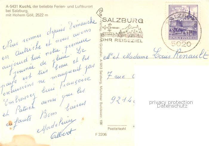 73782577 alte Postkarte Kuchl Salzburg AT Ortszentrum mit Kirche gegen Hohen Goell Berchtesgadener Alpen postalisch gelaufen Erhaltung siehe scans [FriedD77] KatCode: 11390323050207
