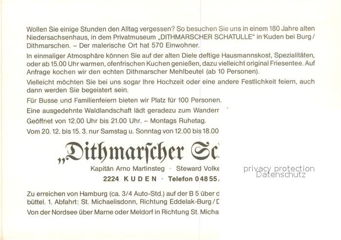 73726338 Kuden Dithmarscher Schatulle Privatmuseum Gaststaette postalisch nicht gelaufen Werbekarte (keine Postkarte) Erhaltung siehe scans [FriedD77] KatCode: 11110001051064