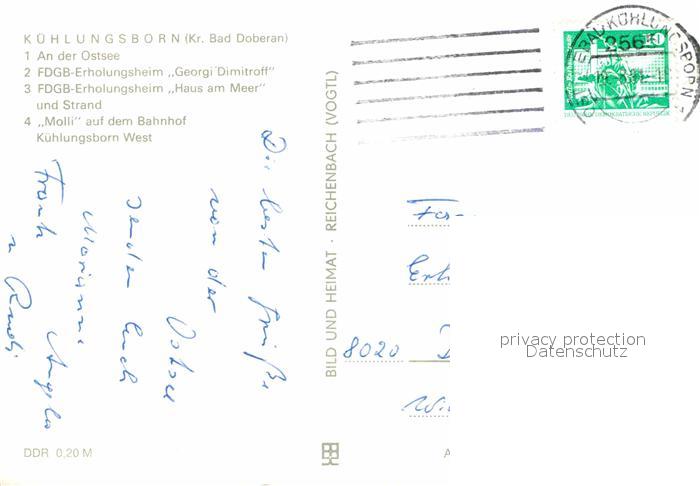 72711512 alte Postkarte Kuehlungsborn Ostseebad Duehnen Strand FDGB Erholungsheime Molli Dampflokomotive postalisch gelaufen Erhaltung siehe scans [FriedD77] KatCode: 11110013051042
