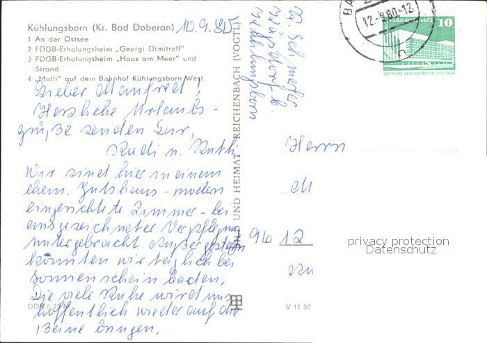 72331331 alte Postkarte Kuehlungsborn Ostseebad FDGB-Erholungsheim Georgi Dimitroff Haus am Meer Strand Molli Bahnhof postalisch gelaufen Erhaltung siehe scans KatCode: 11110013051042