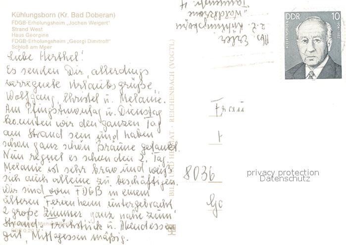73155389 alte Postkarte Kuehlungsborn Ostseebad FDGB Erholungsheim Jochen Weigert Strand Haus Georgine FDGB Erholungsheim Georgi Dimitroff Schloss am Meer postalisch gelaufen Erhaltung siehe scans [WerneD78] KatCode: 11110013051042