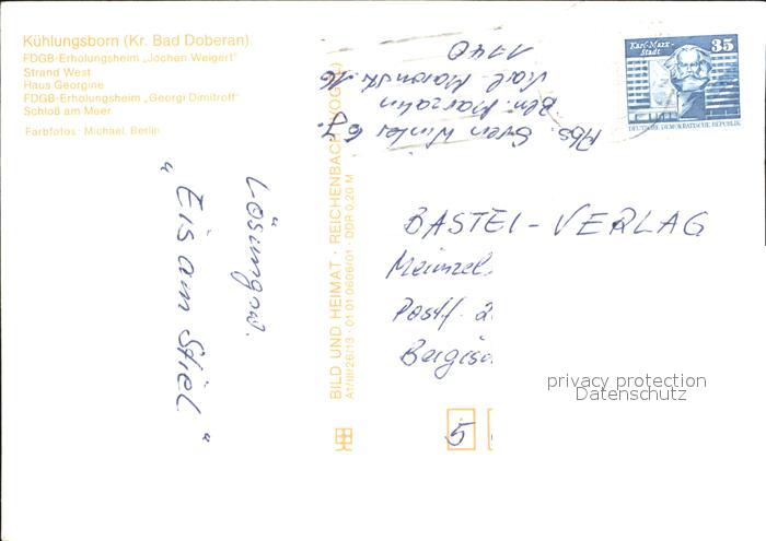72379180 alte Postkarte Kuehlungsborn Ostseebad FDGB Erholungsheim Jochen Weigert Strand Haus Georgine Schloss postalisch gelaufen Erhaltung siehe scans KatCode: 11110013051042
