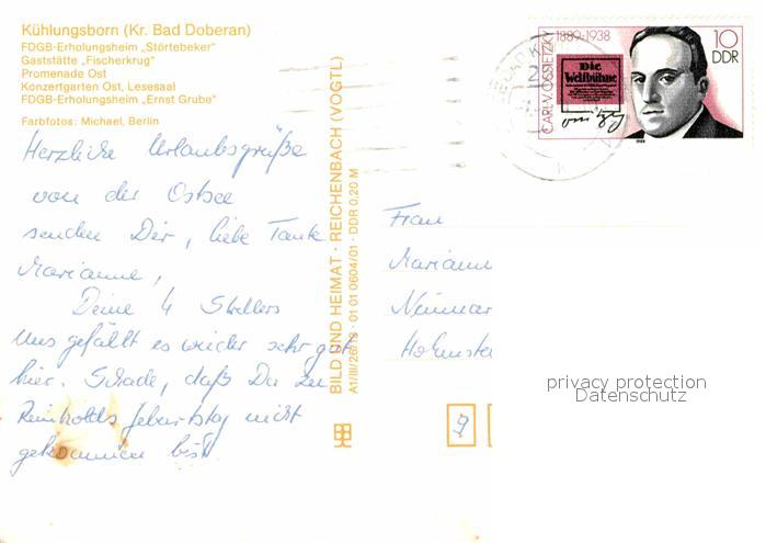72666014 alte Postkarte Kuehlungsborn Ostseebad FDGB Erholungsheim Stoertebeker Gaststaette Fischerkrug Promenade Ost Konzertgarten Lesesaal FDGB Erholungsheim Ernst Grube postalisch gelaufen Erhaltung siehe scans [WerneD78] KatCode: 11110013051042